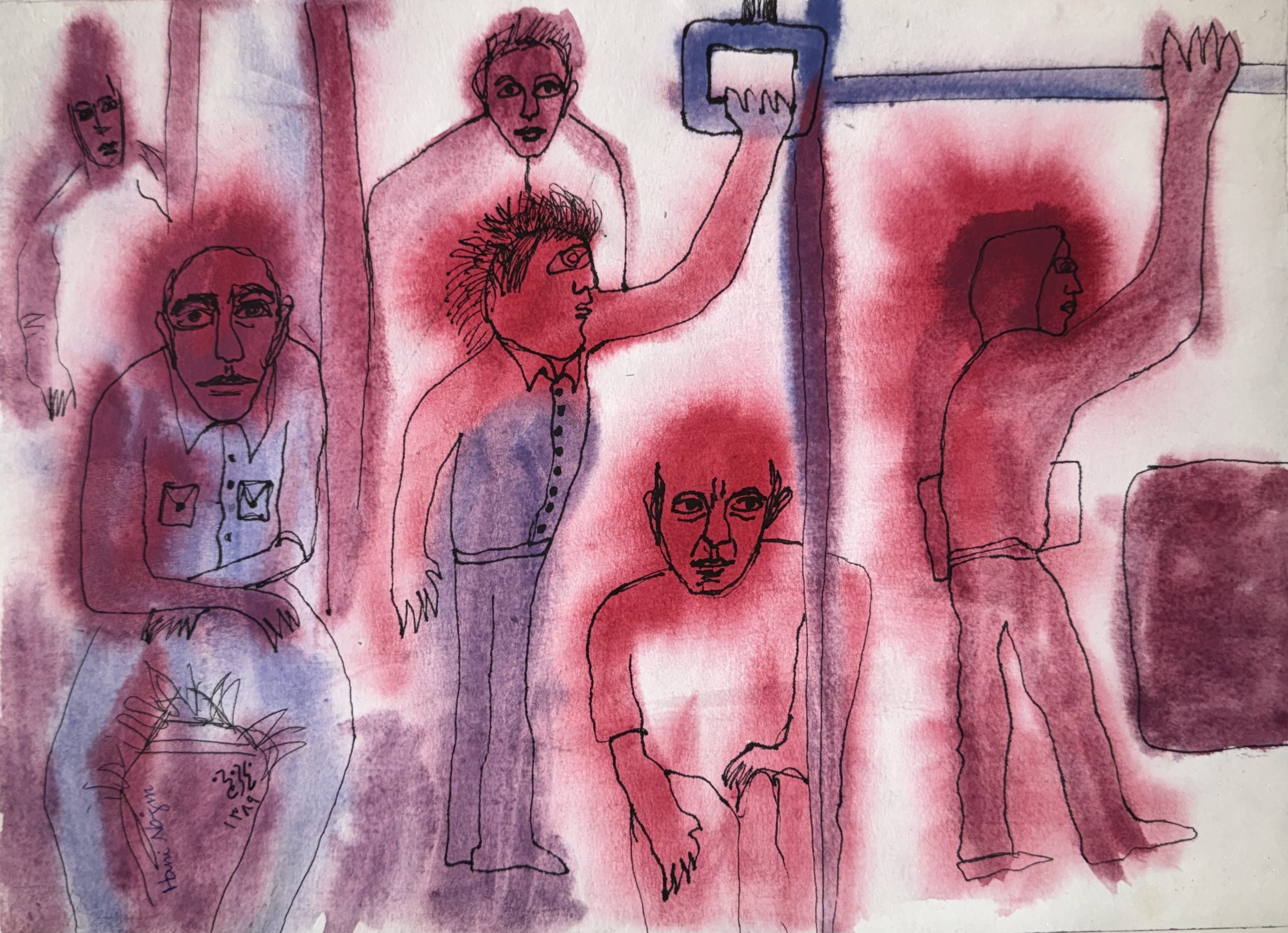 This piece, "Untitled" (2010) by Hani Najm, is a mixed media work on cardboard that captures a crowded, tense contour lines and a dominant color palette of vibrant, diffused red/magenta and cooler blue/purple washes. The figures are depicted in various poses—some seated, some standing and grasping overhead bars—with staring, isolated expressions. The aggressive washes of red create an intense, claustrophobic atmosphere, suggesting feelings of anxiety, alienation, and compression within the urban experience. The work blends figurative drawing with abstract use of color to evoke a powerful emotional state.
