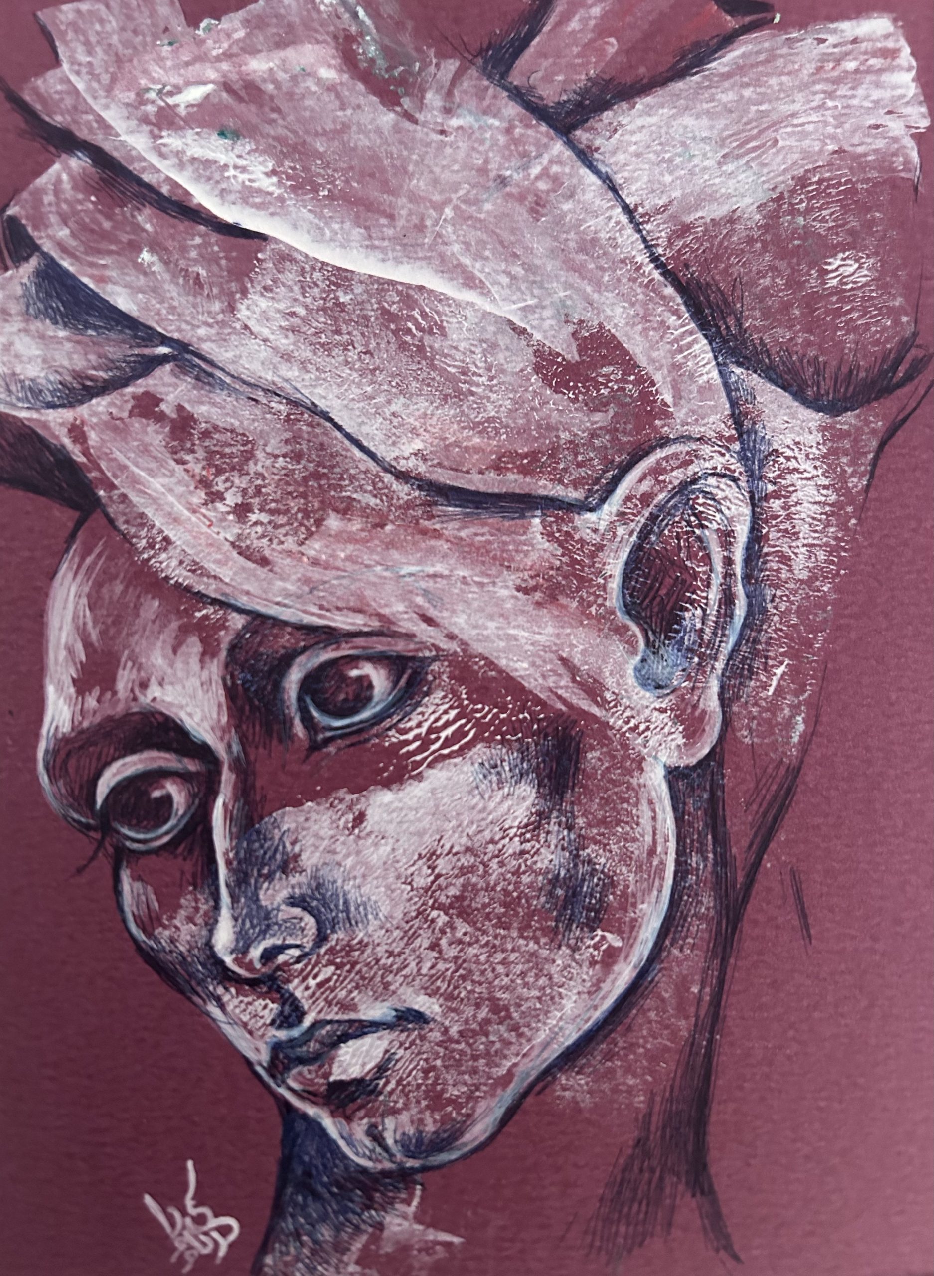 Untitled (2020) by Samira Daya presents a contemplative figure rendered in layered mixed media on deep burgundy cardboard. Soft, textured washes of white and pink merge with precise, dark linear details, creating a sense of vulnerability and introspection. The face appears partially obscured by organic, petal-like forms that echo themes of transformation and emotional weight. Through its intimate scale and expressive mark-making, the piece evokes a quiet psychological depth, inviting viewers to reflect on inner states and shifting identities.